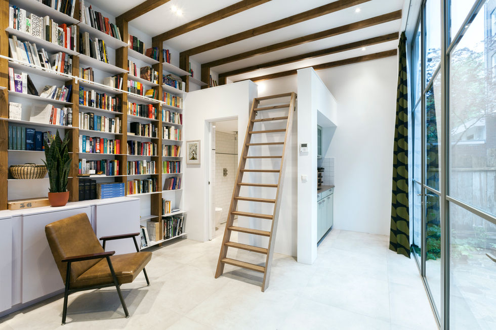 De interne hoogte van 3.6m geeft ruimte voor een mezzanine met slaapruimte, badkamer en keukentje.